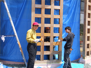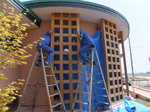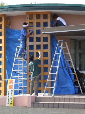 格子状の形状で高さもあるものだったので、養生の仕方(梁に紐でくくったビニールシートを縛りぶら下げる)、塗装の段取りの組み方等、実際に体験して学ぶことが多かったです。