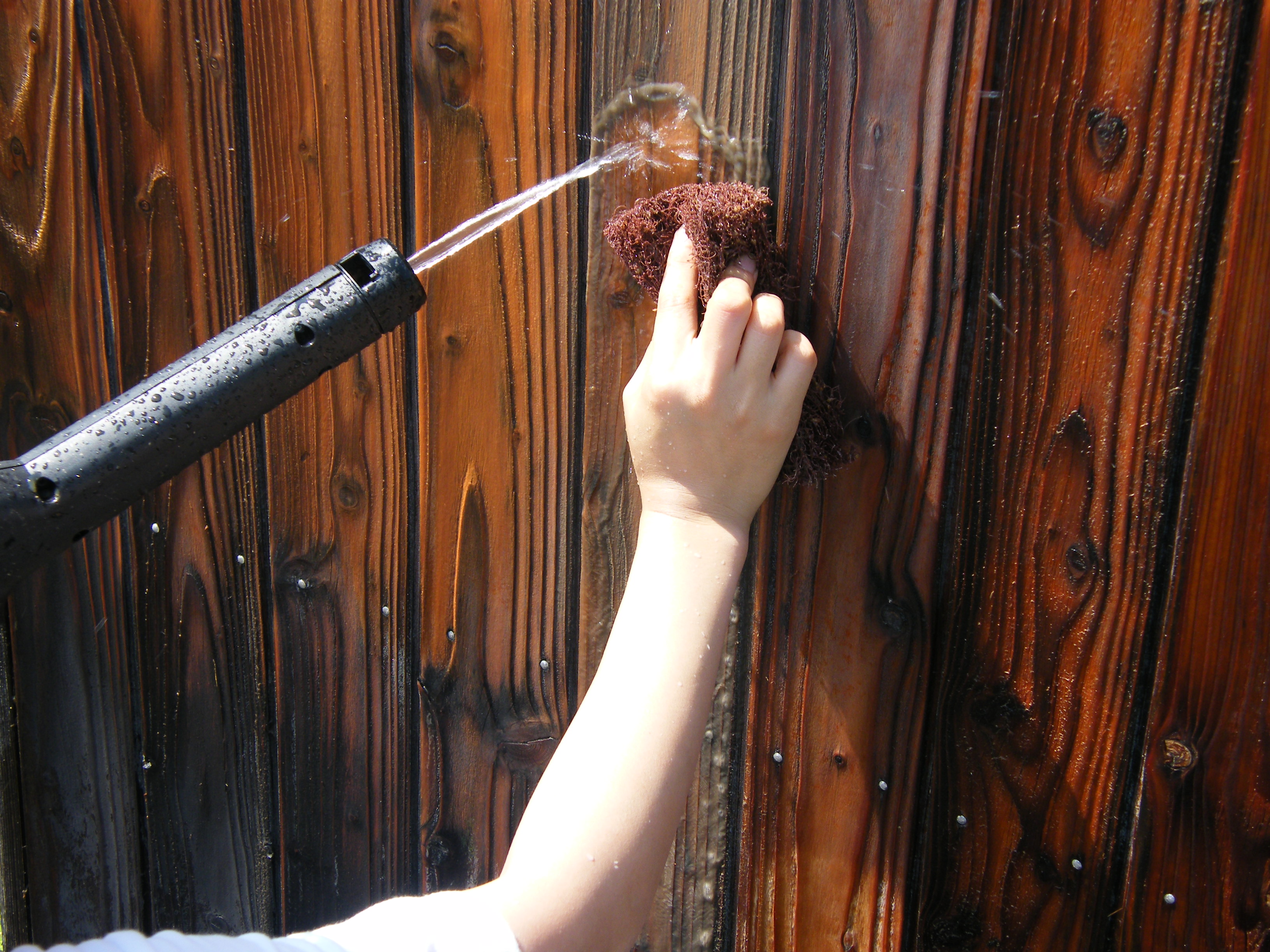 まずは、木材と塗料の密着が良くなるように外壁の汚れを水洗いで落とします。高圧洗浄機をお持ちであれば簡単に汚れを落とせますが、木材にノズルを近づけすぎて傷めないようにお気を付け下さい。