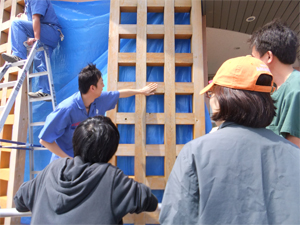 格子状の形状で高さもあるものだったので、養生の仕方(梁に紐でくくったビニールシートを縛りぶら下げる)、塗装の段取りの組み方等、実際に体験して学ぶことが多かったです。