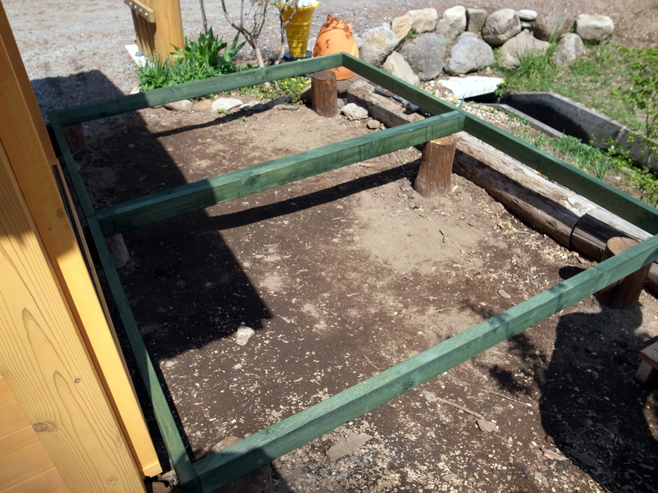 2つの四角形ができたら、丸太の上にのせて枠と丸太を固定します。