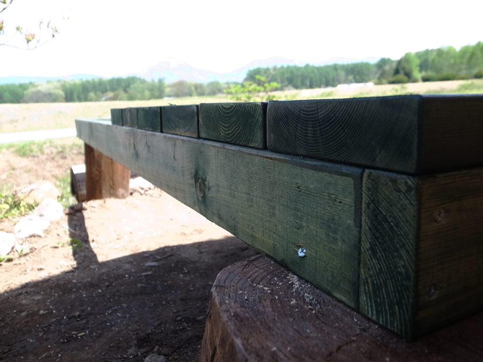ウッドデッキの一番外側の木材は、枠より少し外に出すように張るとかっこよく見えます。上級者の方は全ての板上のビスが一直線に並ぶようにこだわるそうです。